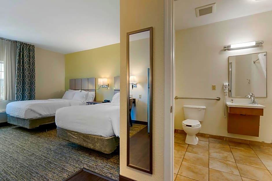 This room features a kitchenette with kitchenware, a 32-inch flat-screen TV, a recliner, 2 double beds, dining table with chairs and a bathroom.